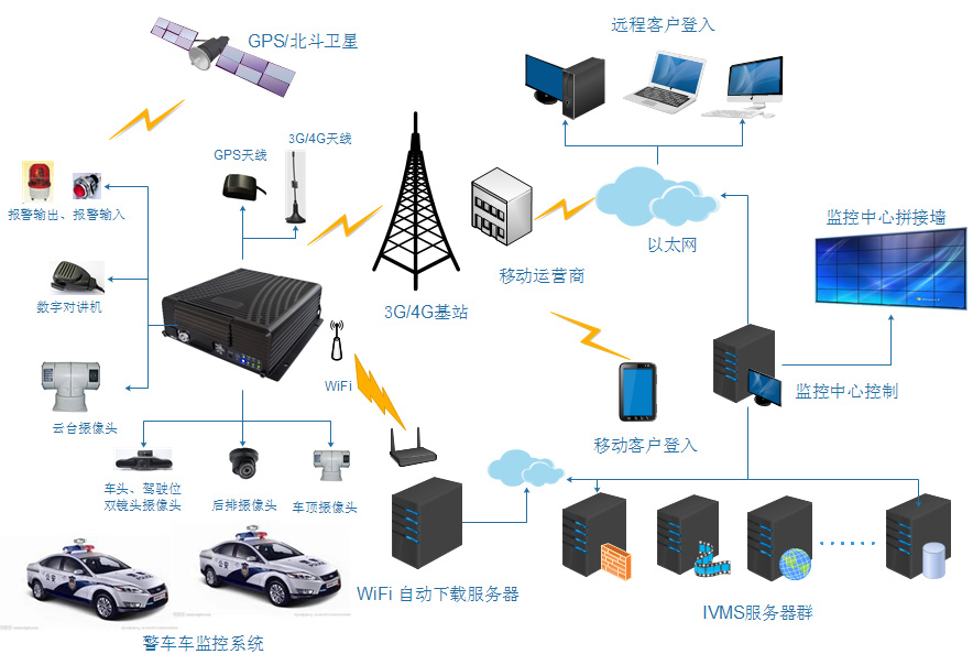 系統通過MDVR主機完成對音視頻、GPS、報警數據進行編碼、存儲。并通過3G/4G移動網絡完成音視頻、報警信息、GPS數據的上傳;同時實現設備遠程升級、參數修改、數字對講、遠程抓拍等遠程管理操作。