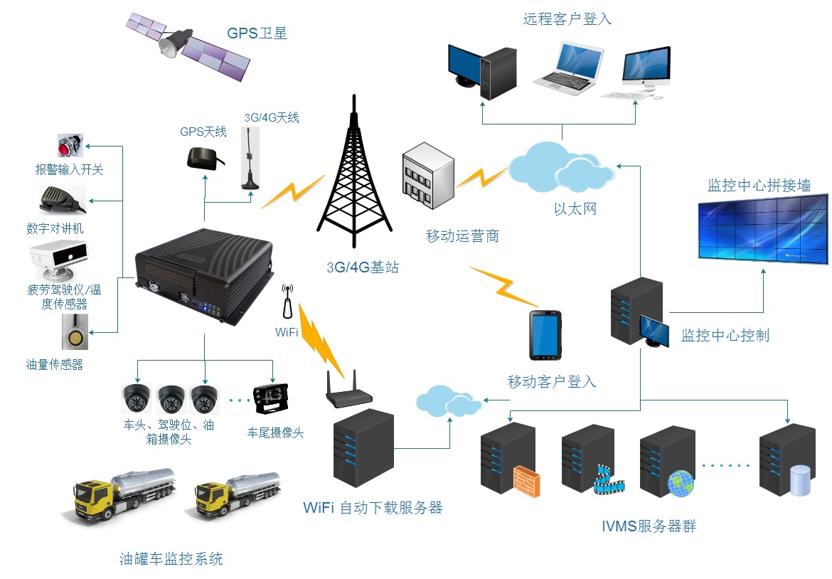 系統通過MDVR主機完成對音視頻、GPS、報警數據進行編碼、存儲。并通過3G/4G移動網絡完成音視頻、報警信息、GPS數據的上傳;同時實現設備遠程升級、參數修改、數字對講、遠程抓拍等遠程管理操作。