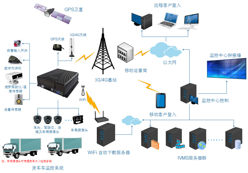 系統通過MDVR主機完成對音視頻、GPS、報警數據進行編碼、存儲。并通過3G/4G移動網絡完成音視頻、報警信息、GPS數據的上傳;同時實現設備遠程升級、參數修改、數字對講、遠程抓拍等遠程管理操作。